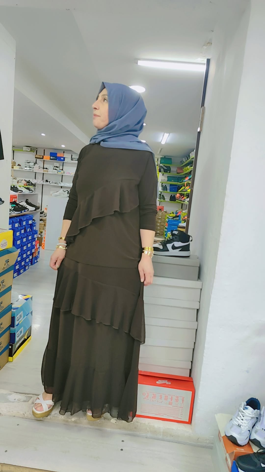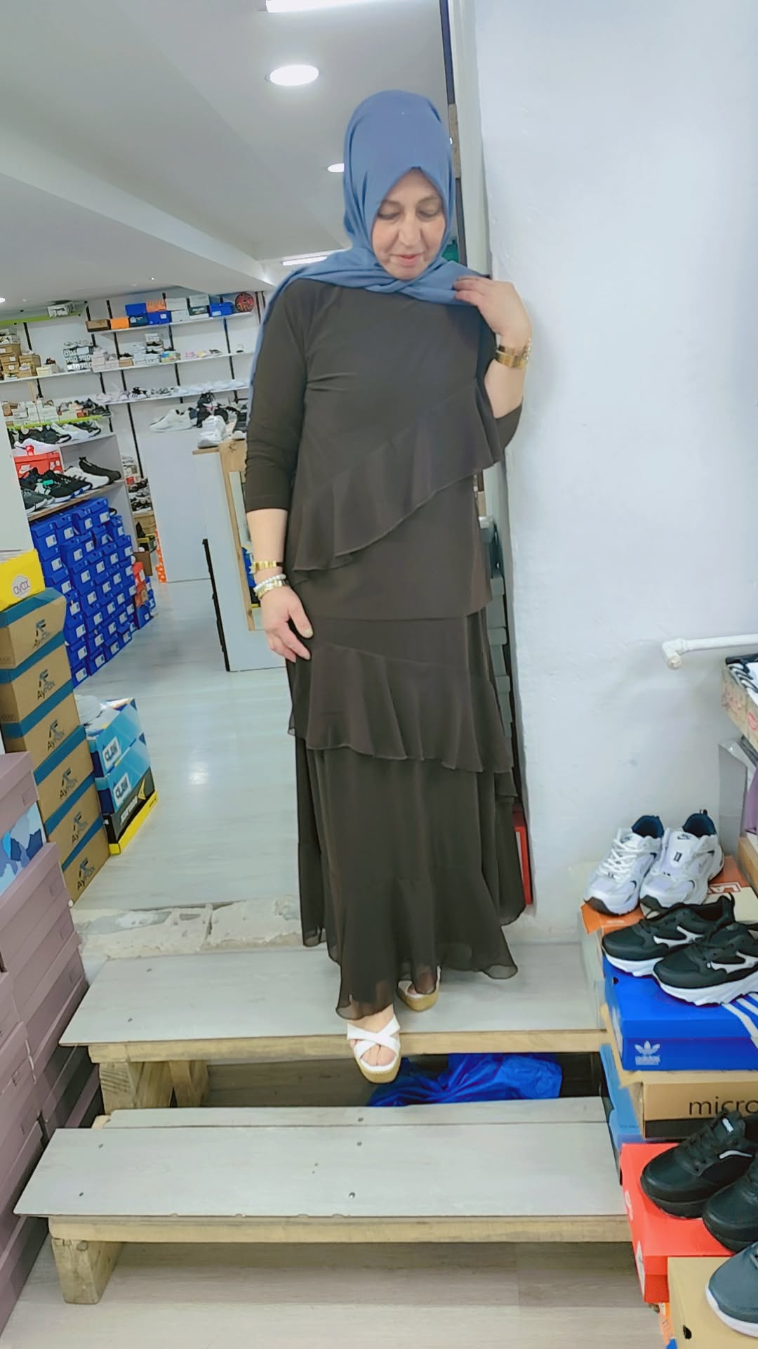 - Üst kısım, ön bölümünde asimetrik ve katlı (volanlı) detaylara sahip uzun kollu bir tunik formundadır. Alt kısım ise tunikle uyumlu, dökümlü ve geniş kesim bir etekten oluşmaktadır.